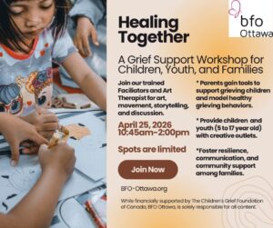 BFO is offering a Half Day Grief Workshop for Children, Youth, Parents and/or Guardians that Bereaved Families of Ontario – Ottawa Region is offering.